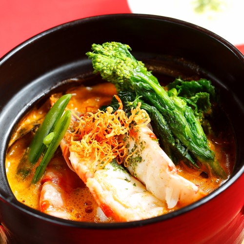 【オマールエビや様々な魚介類、お野菜からとった濃厚なソース! マッシュポテトで味の変化も楽しめ、美味しさ2倍増し!!マルク自慢のお料理です。 鍋には食材の美味しさがギュッ~と詰ってます。当店の看板メニューです!】