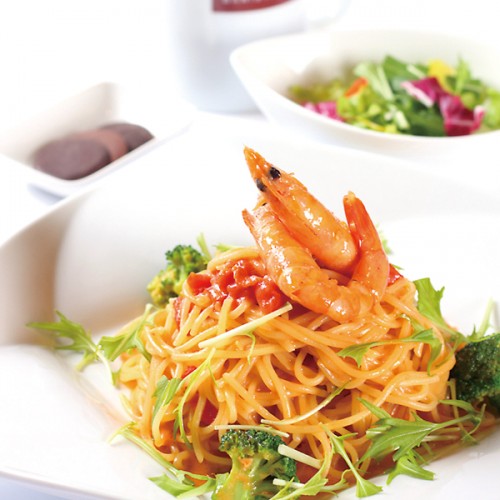 新鮮なエビと濃厚なフレッシュトマトクリームソース!!生パスタのもちもち食感がたまらないっ☆ランチタイムならセットでお得な価格で味わえます。