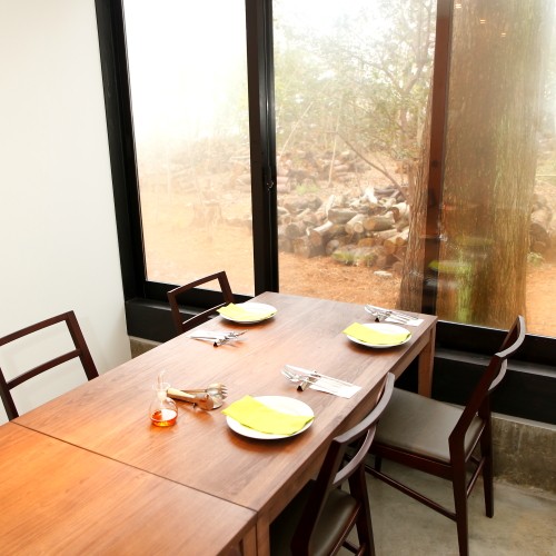 1500坪の広大な敷地を使った非日常空間…!!一面のガラス張りから陽射しがたっぷり降り注ぎ、お店を囲む大きな木々を見渡せる。夜の景色もまた格別。デートや大切な記念日など特別な場面にもふさわしい贅沢な空間。