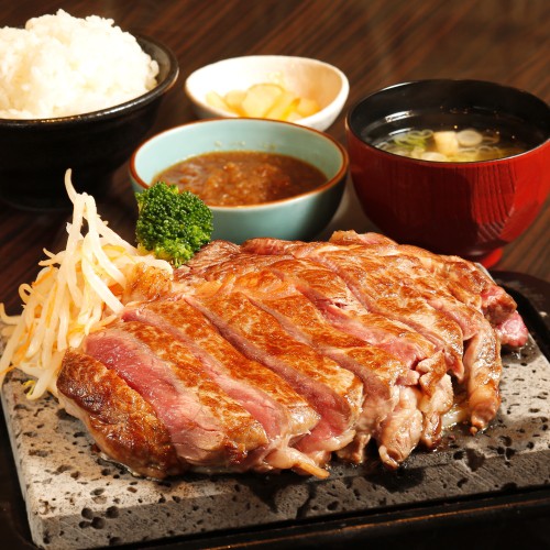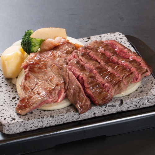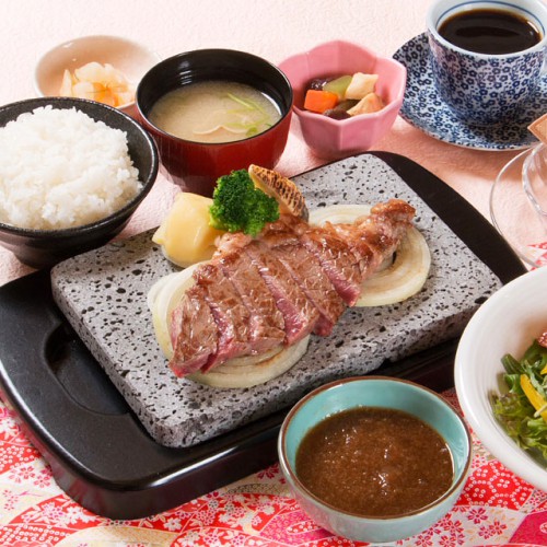 全てのステーキをレアで提供する事で300度の熱々溶岩石で、好みの焼き加減と 余分な脂を吸収し旨味を残すためヘルシー!! 遠赤外線効果でゆっくり火を通すから柔らかでジューシーなステーキを楽しめます。 肉質もこだわり、選べるソースはディナーなら5種より!!