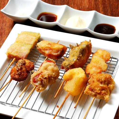 まんまるの自慢は何と言ってもこの「串揚」!!季節の野菜や肉・魚、デザート感覚で楽しめるものまで多彩な串揚が揃っています。迷って選べない方のために、おまかせ4点盛りや8点盛りもご用意♪5種のソースが付いてくるのでお好みの味付けでお召し上がりください。