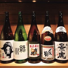 店主がセレクトの地酒が大好評!その日おすすめの1杯も含め10種以上取り揃えております。飲み放題付コースでも写真の地酒5種の注文が可能。(吉乃川 厳選辛口/越乃景虎 龍/〆張鶴 花/緑川 清酒/雪男 辛口清酒)その他生ビール、果実酒、カクテル、ワインなども含まれております。