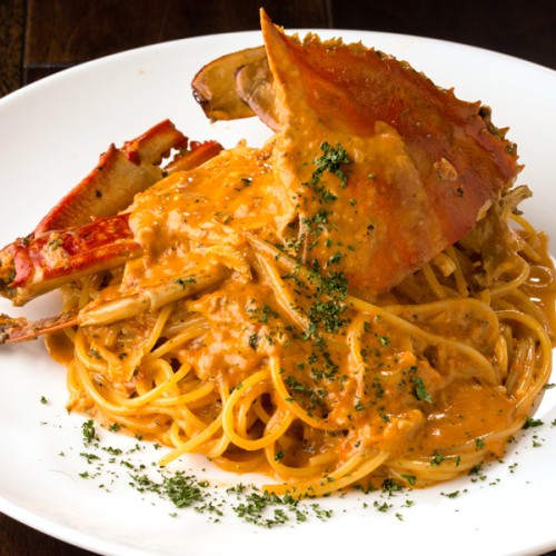 新鮮なカニが入荷した時だけ提供できるこちらのパスタ。蟹の旨味を最大限に引き出しトマトソースと一緒に絡めました。