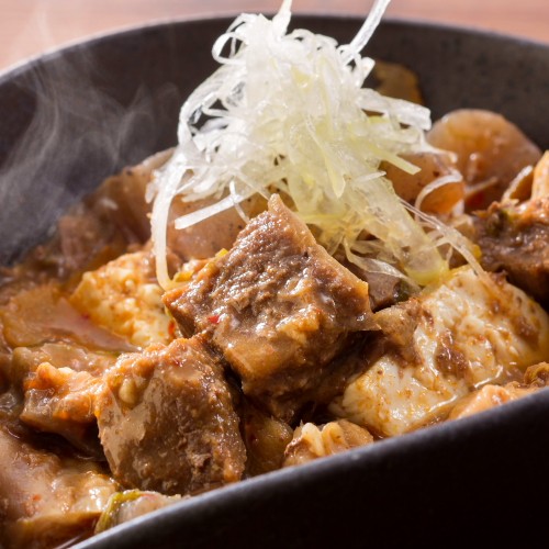 ピリ辛に煮込んだ牛すじを豆腐と一緒に煮込みました。