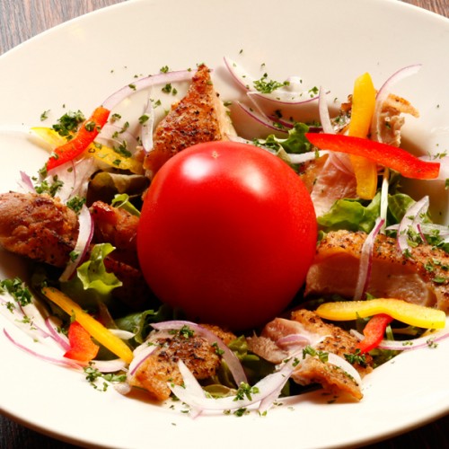 丸ごとトマトとグリルチキンカルパッチョ~トマトと赤ワインのジュレのサラダ仕立て~