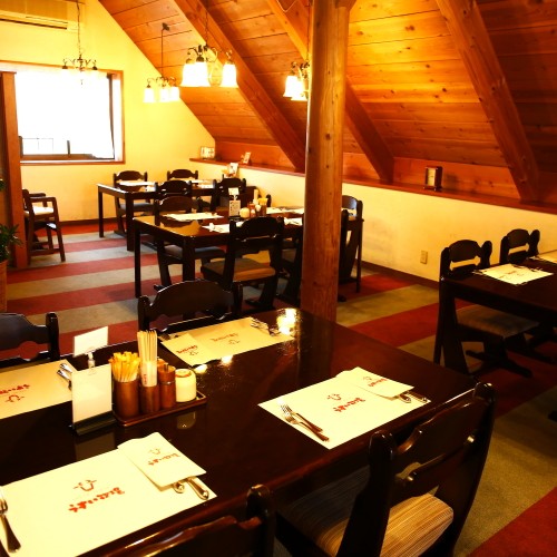 まるで山小屋の屋根裏のような、おこもり感たっぷりの2F席…。